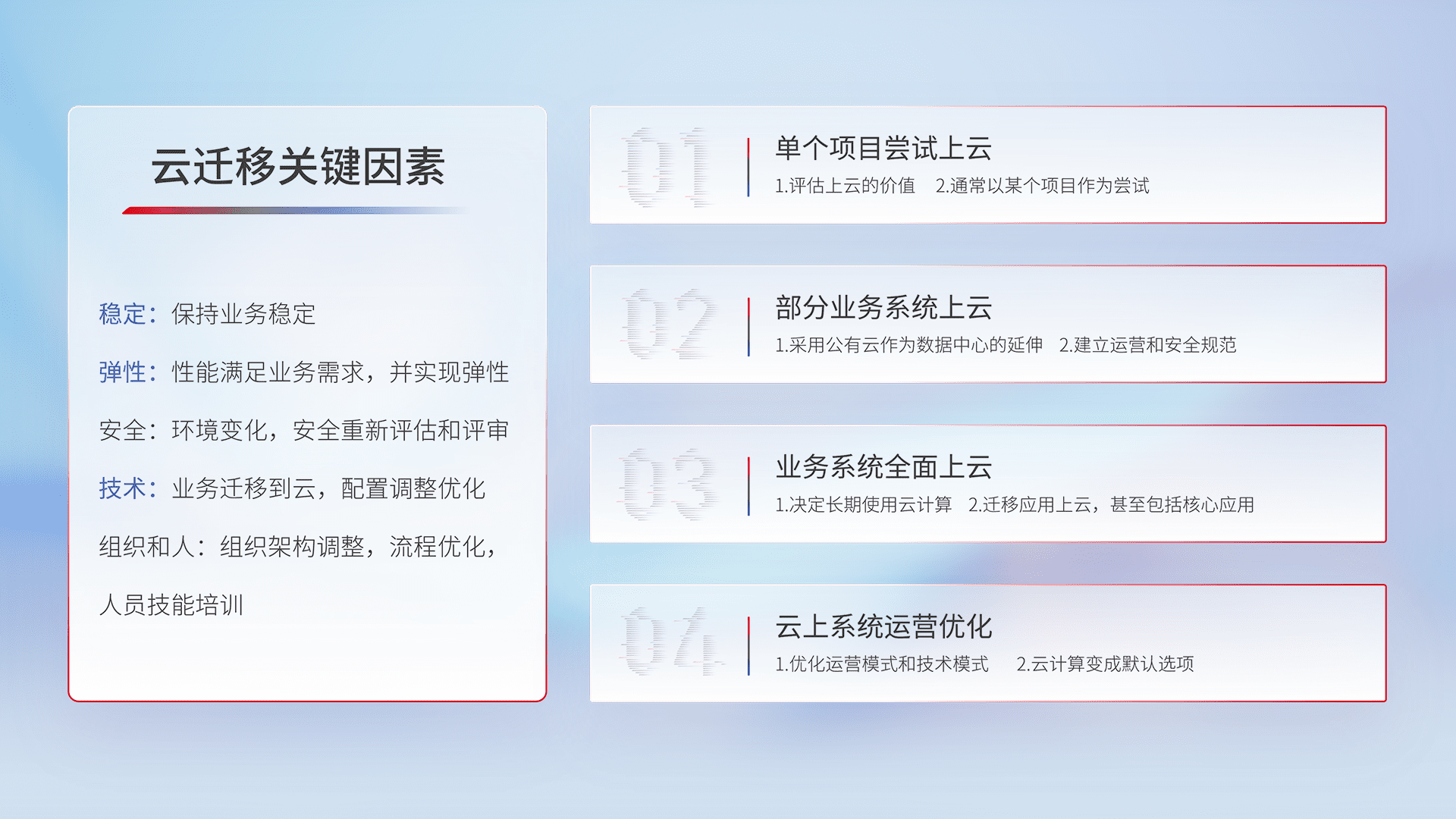 结合实际业务,,,,从规划设计、、、云平台选型、、、云原生改造、、数据迁移、、集成交付,,,,迁移全过程为客户识别最佳上云路径,,,,做好风险识别管理,,,设计网络架构、、身份权限、、、、安全审计合规、、、、操作审计、、、日志审计、、、、监控告警策略、、、多站点容灾设计等,,,对云上基础设施进行整体规划,,,提升IT治理水平,,,以满足弹性、、、高可用、、、、高性能的需求。。