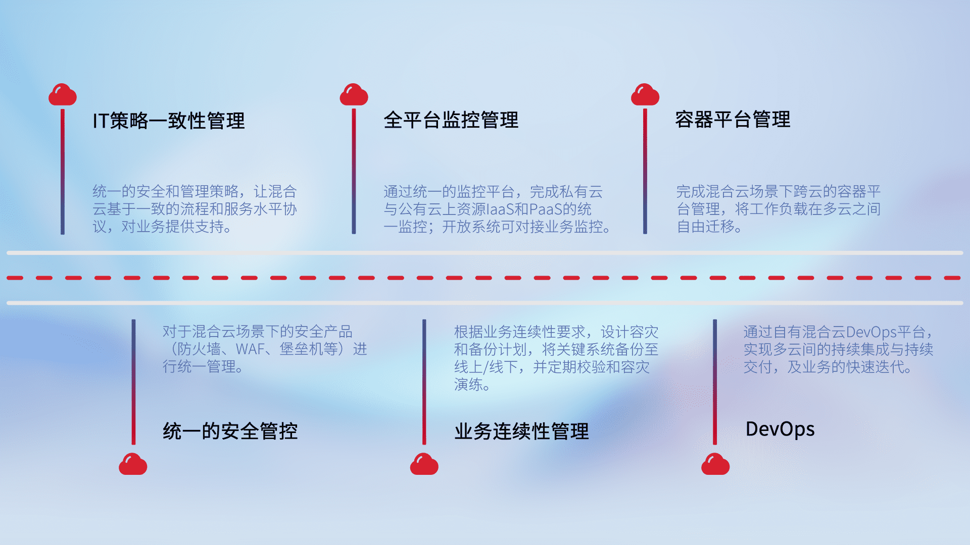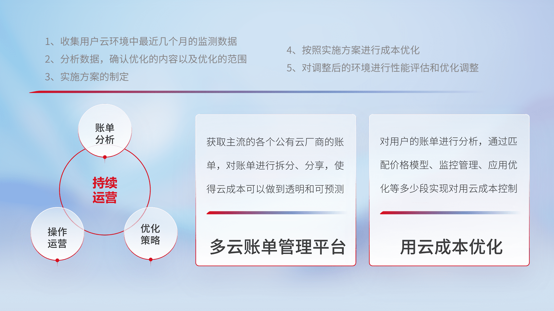 通过多云纳管,,,,以统一的资源数据模型把客户的云资源进行抽象和封装,,,进而实现对多云资源的统一操作,,,,保障云资源管理的可靠性、、稳定性与可用性。。量身定制化运维内容,,,,配置、、开发运维、、、补丁管理、、备份、、、、监控、、认证和访问管理、、审计和日常巡检等,,,保障在用云过程中的可靠度,,稳定度以及高可用率。。。。