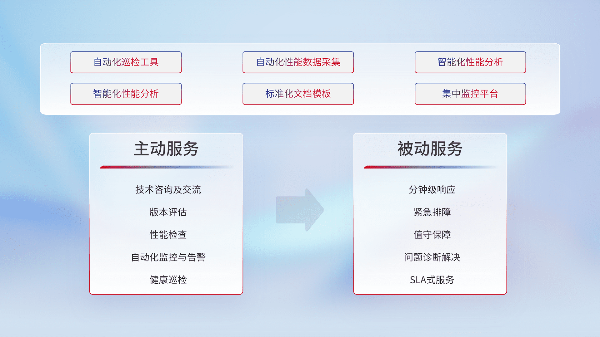 智能化工具和标准化文档,,,保障服务质量,,,,提供主动服务(包含技术咨询、、、版本评估、、性能检查、、、、自动化监控与告警、、、、健康巡检)和被动服务包含(分钟级响应、、紧急排障、、值守保障、、、问题诊断解决、、SLA服务)。。。。